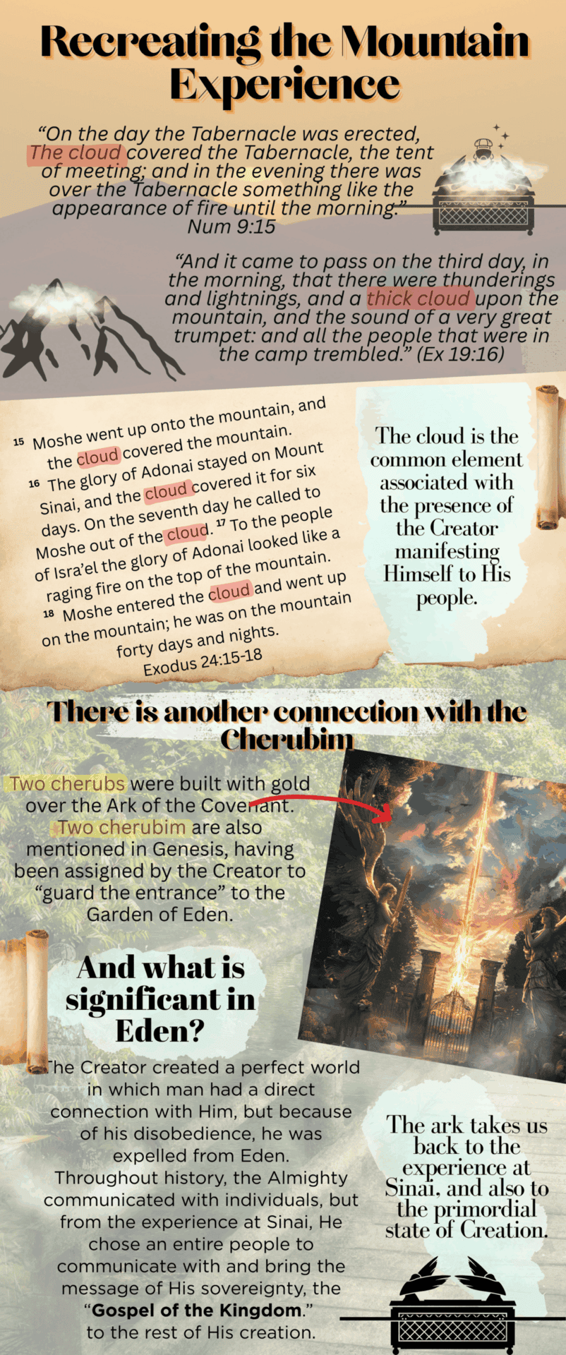 The connection between the cloud, the Ark of the Covenant, and the experiences at Mount Sinai and the Garden of Eden shows us the continuity of divine guidance and protection throughout biblical history. According to rabbinic commentators such as Rashi, the cloud not only provided physical guidance, but was also a symbol of the constant and protective Divine Presence (Rashi on Numbers 9:15). This narrative invites us to reflect on the importance of relying on divine guidance in our own spiritual journey.